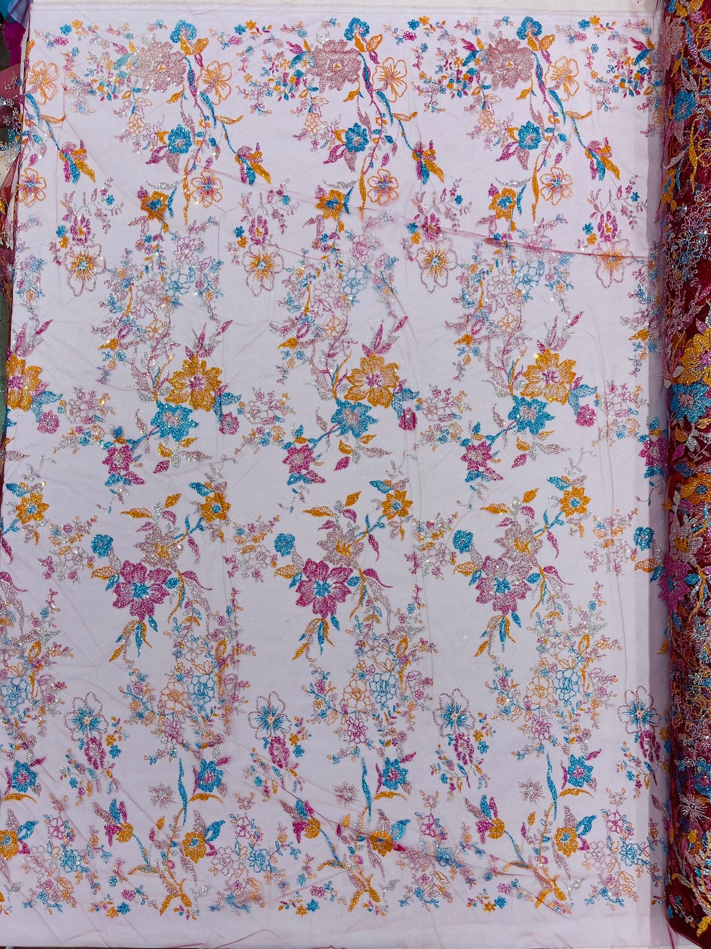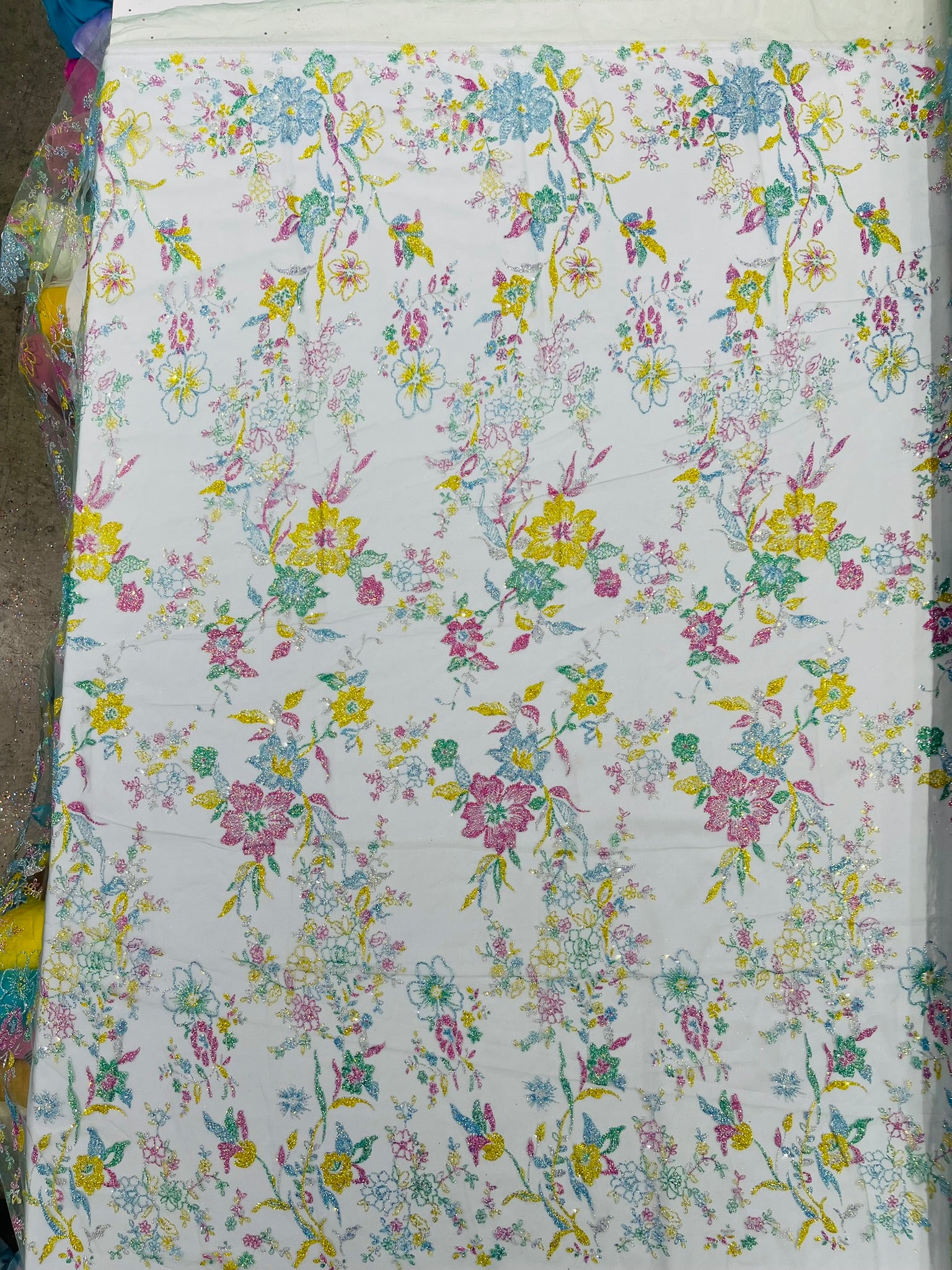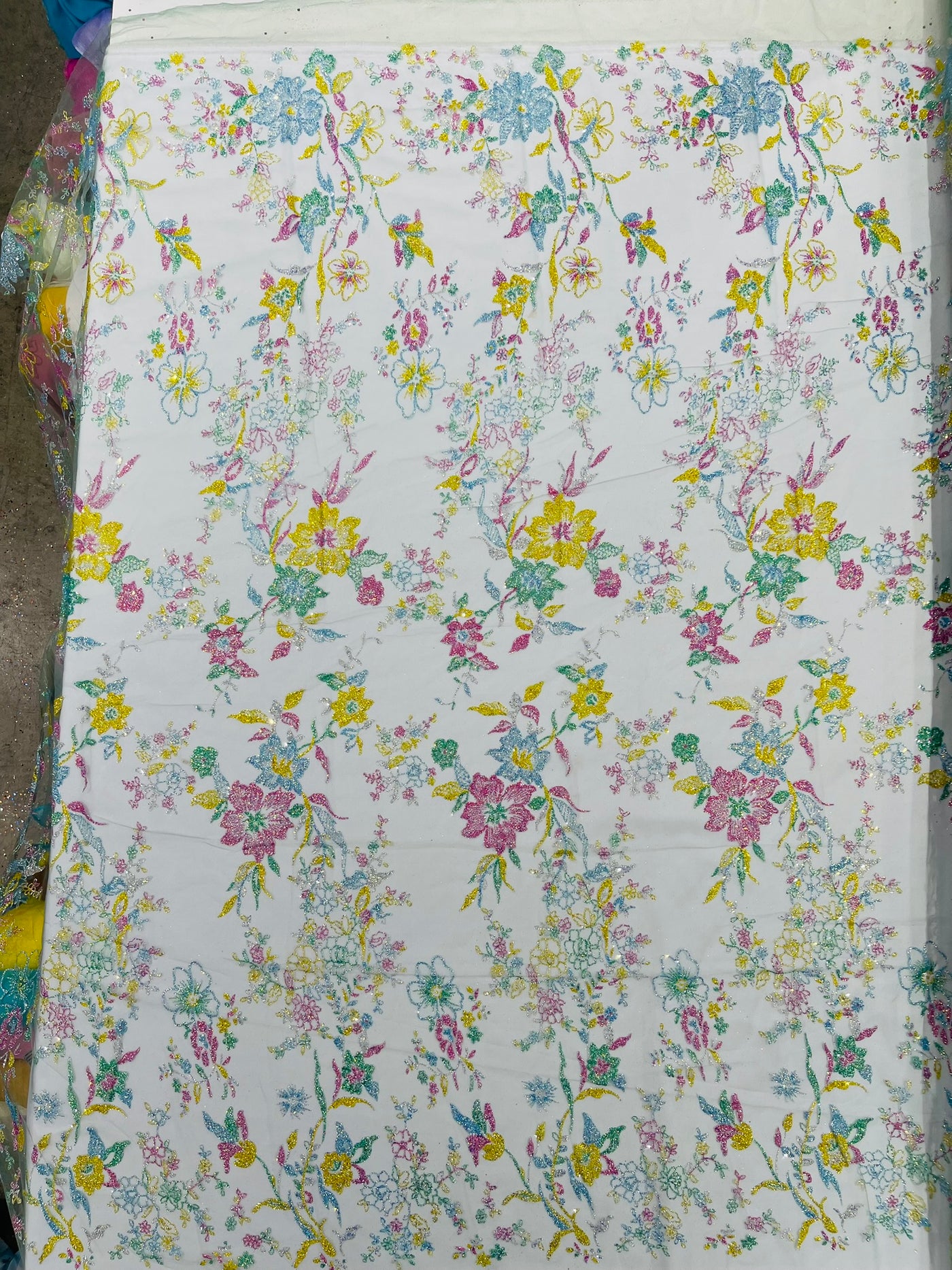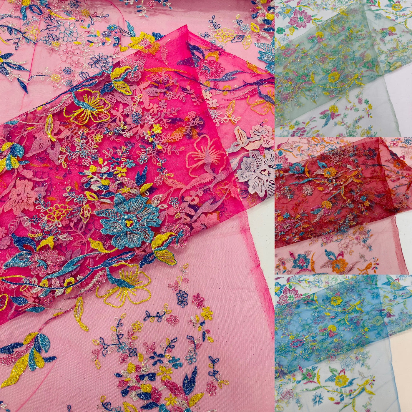 This shiny Multi Color Roses Glitter design is made up of glue on a Mesh with glitter on the design. This lace is modern but yet classy and the glitter gives it's a beautiful look. The lace can be use for dresses, tablecloths, runners, decoration, skirts, jackets, nightgowns, prom dresses, apparel and much more.