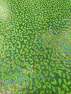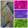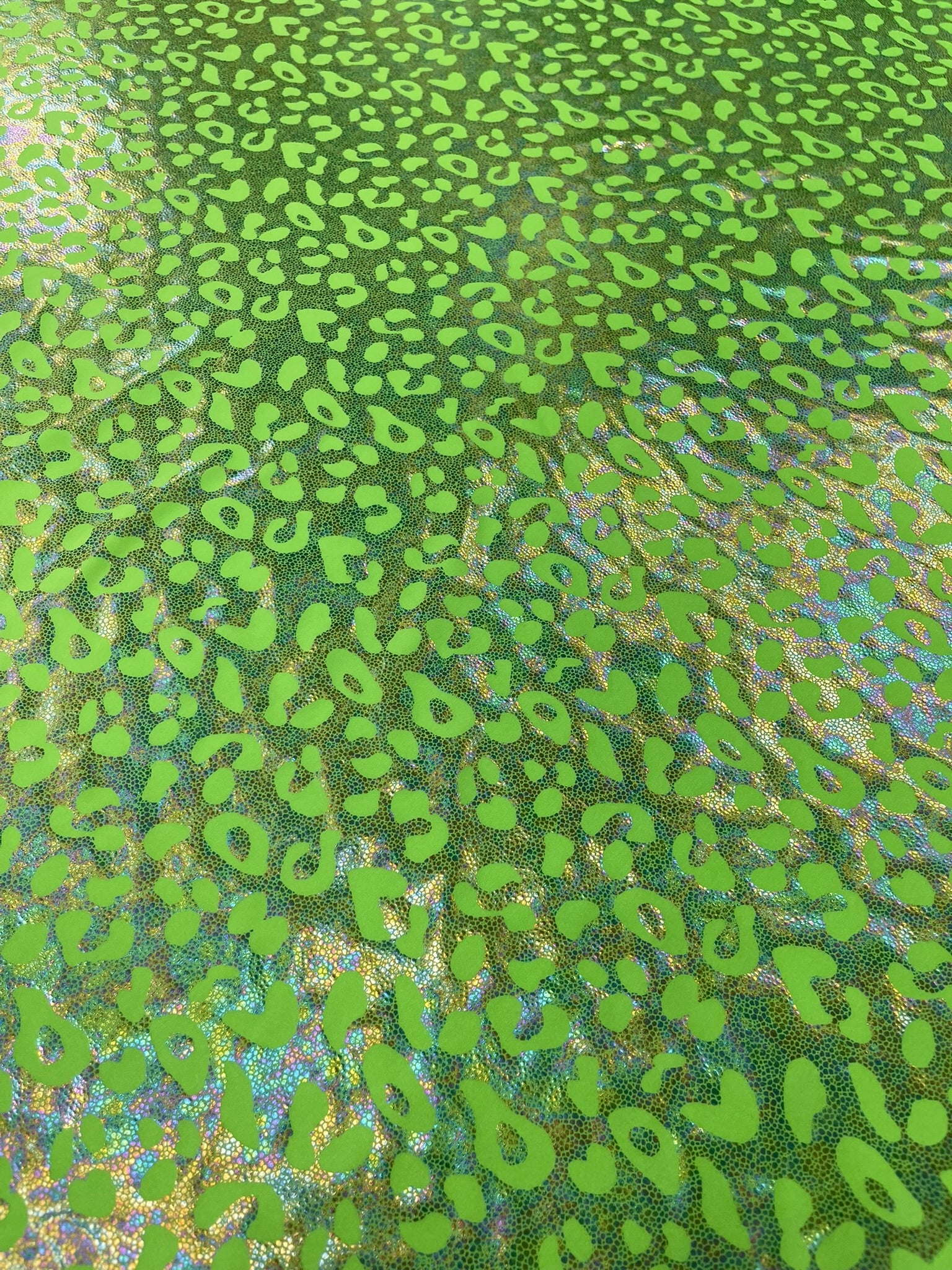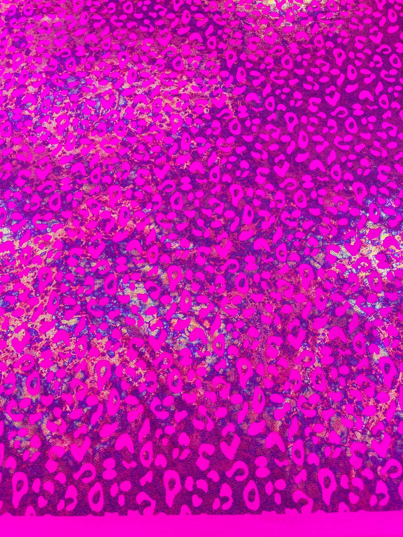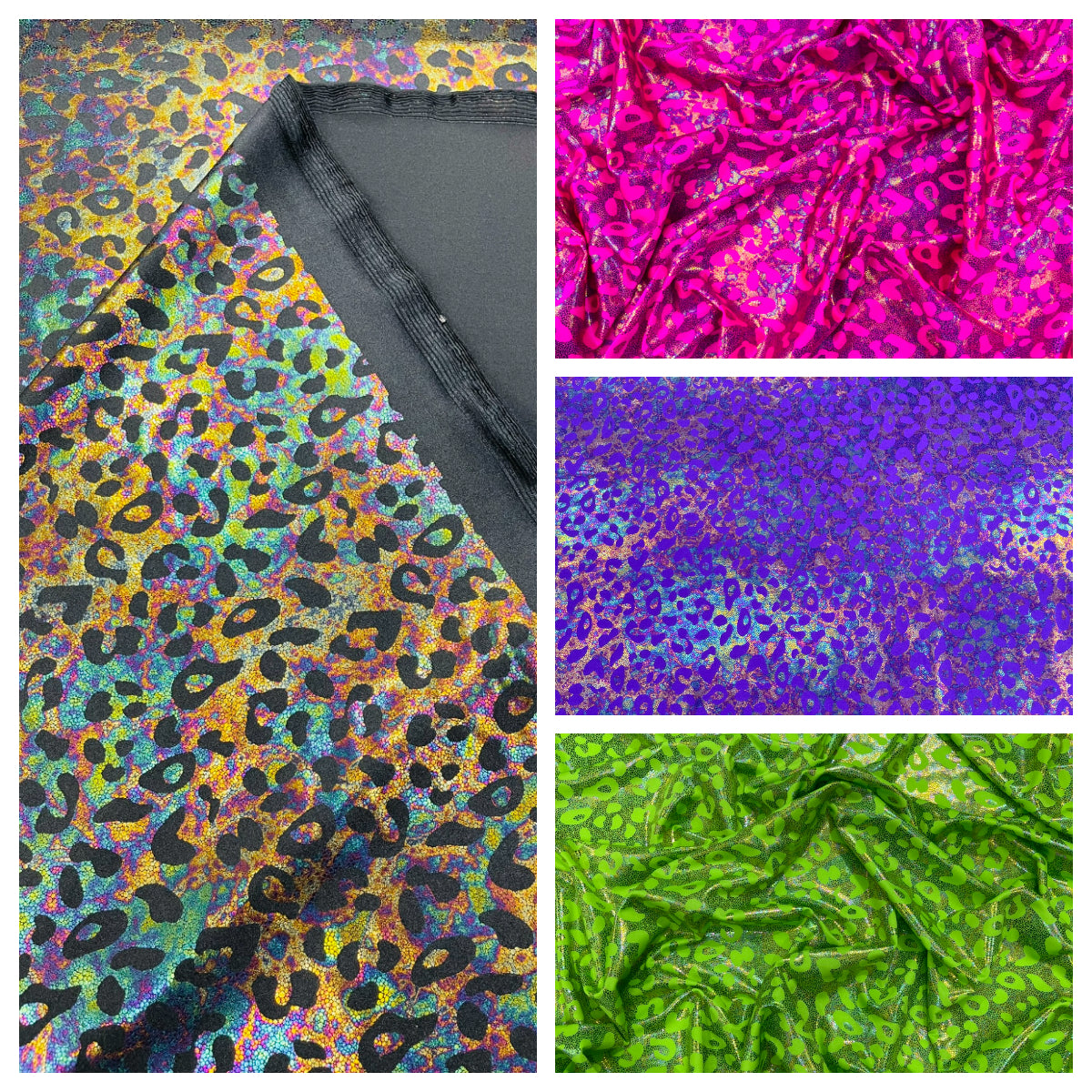This leopard stretch fabric is 80% Nylon and 20% Spandex with a black stretch milliskin . It features a reflective and shimmering leopard print. This leopard print are Ideal for costumes, dresses, leggings, clothing, nightgowns, prom dresses, swim suits, interior décor and much more..