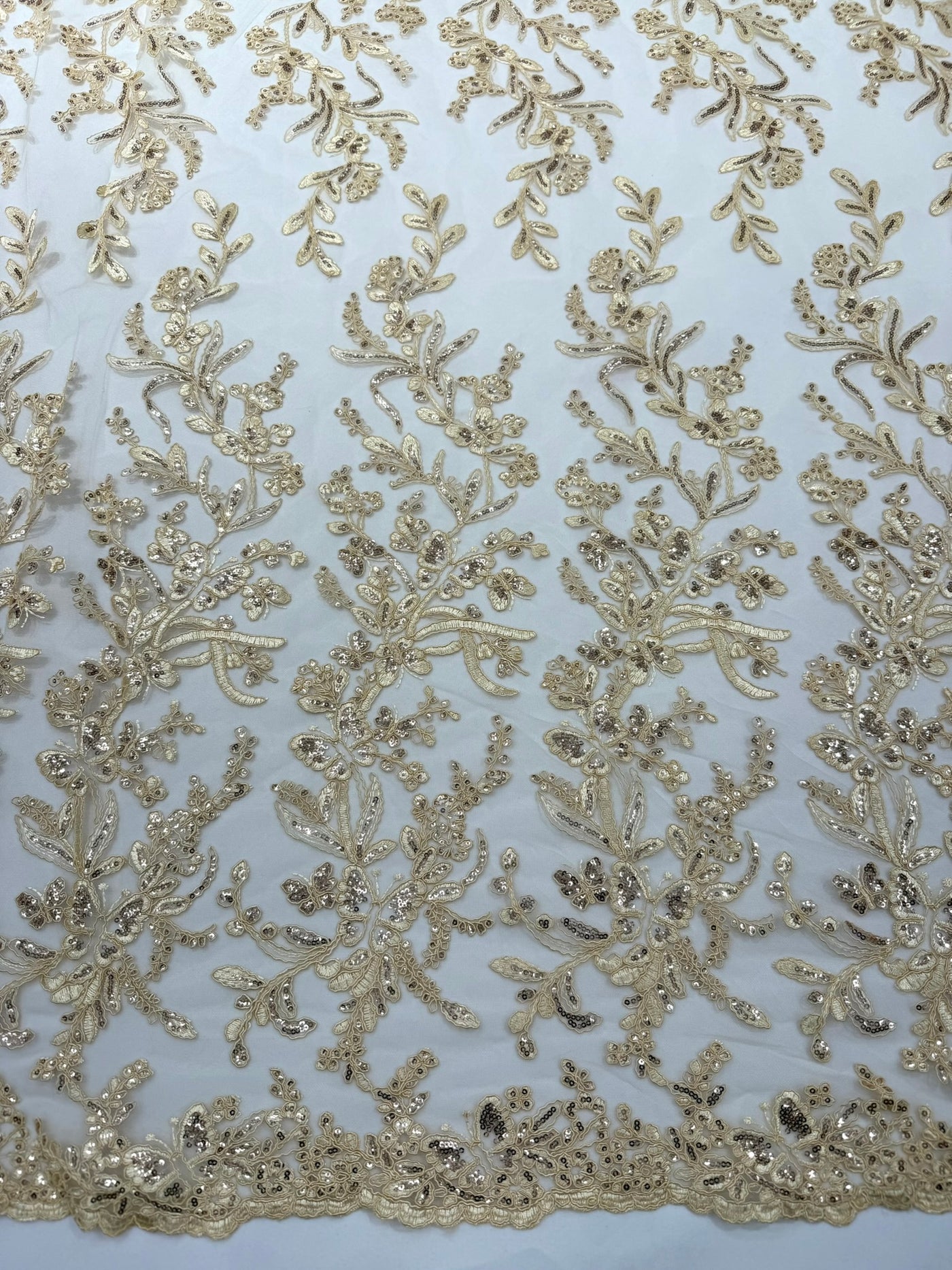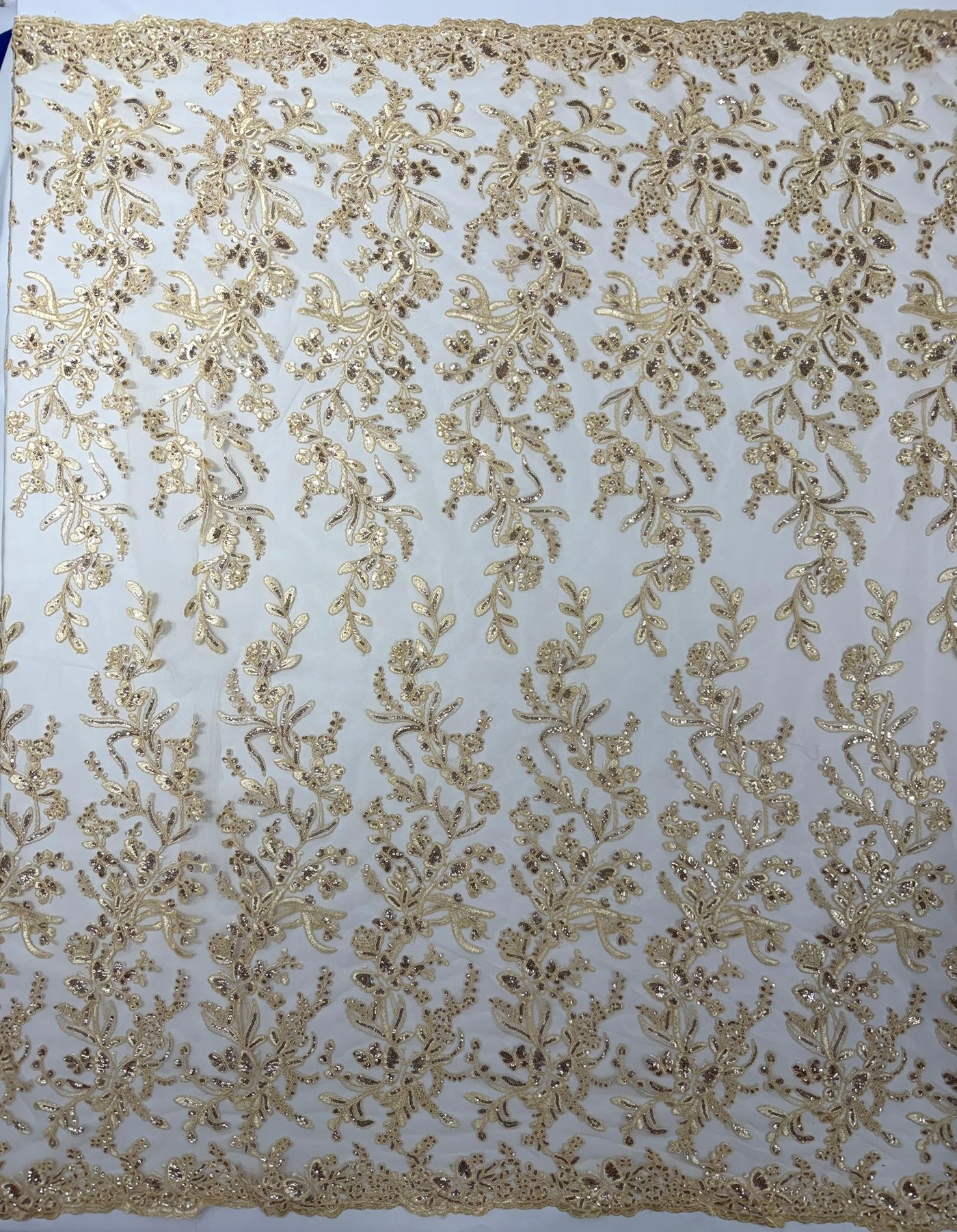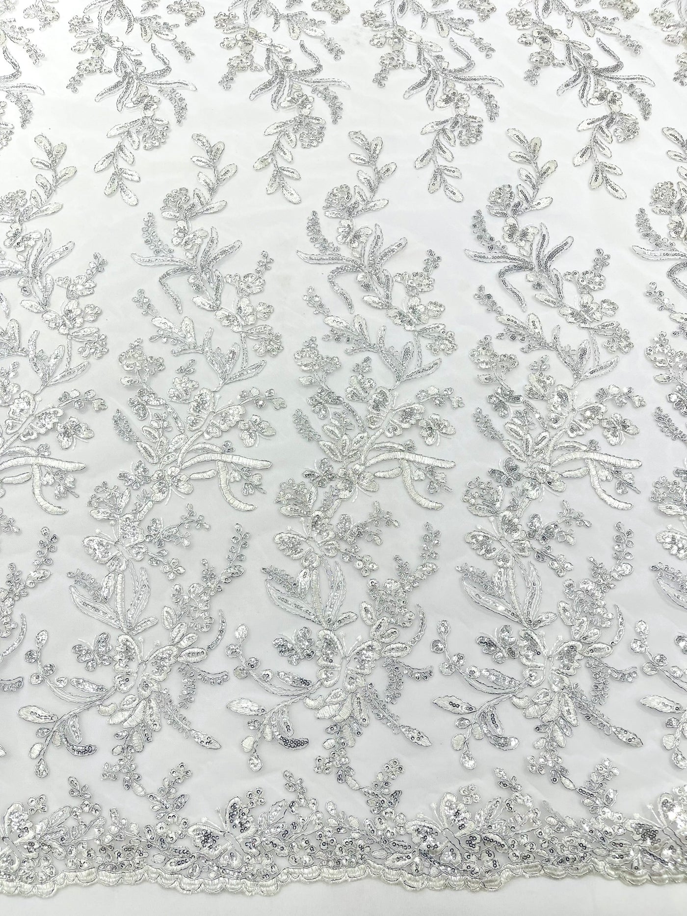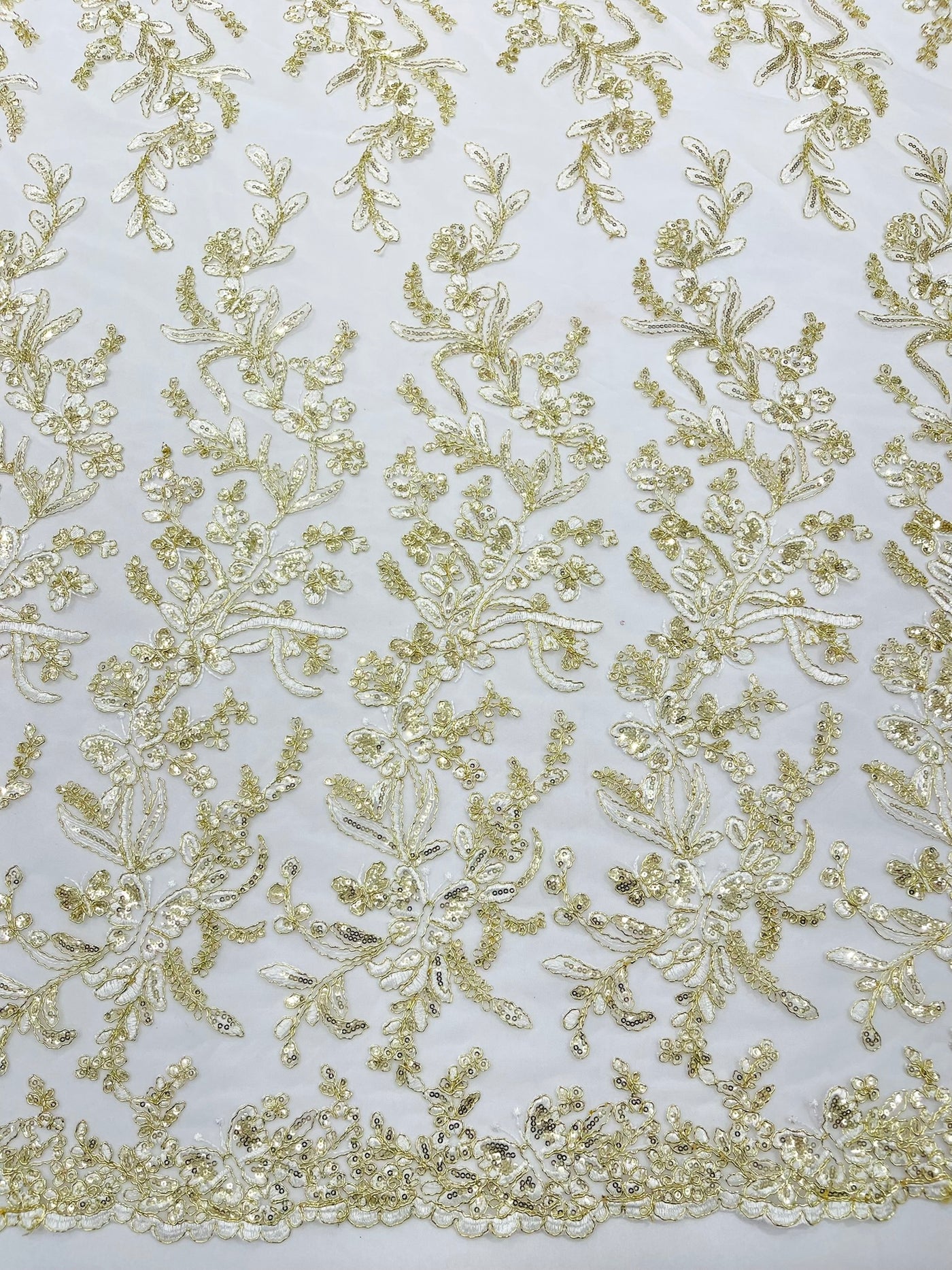 This luxurious lace showcases beautifully embroidered butterfly metallic corded flowers, accented with sequins that catch the light beautifully, creating a captivating sparkle. The fabric features a double scalloped edge along the width, adding an extra layer of refinement to its exquisite design.