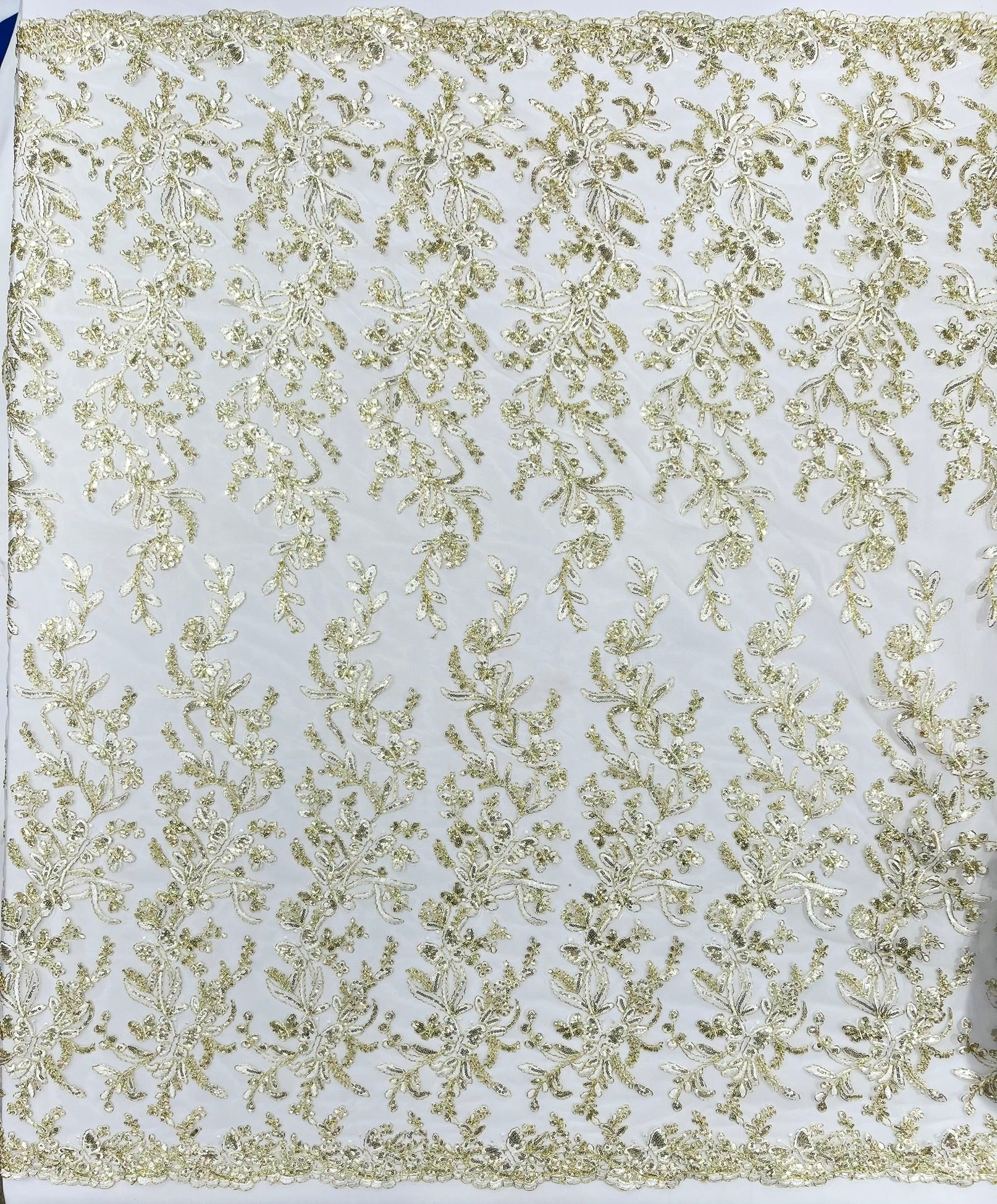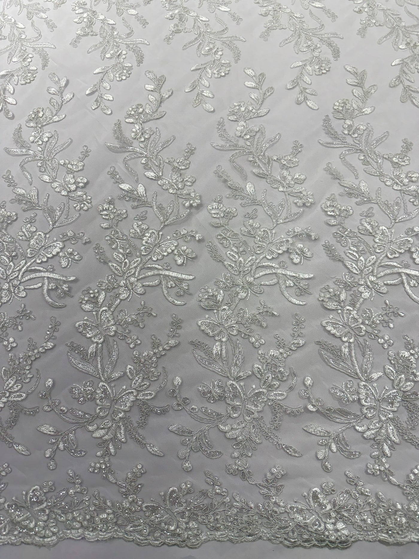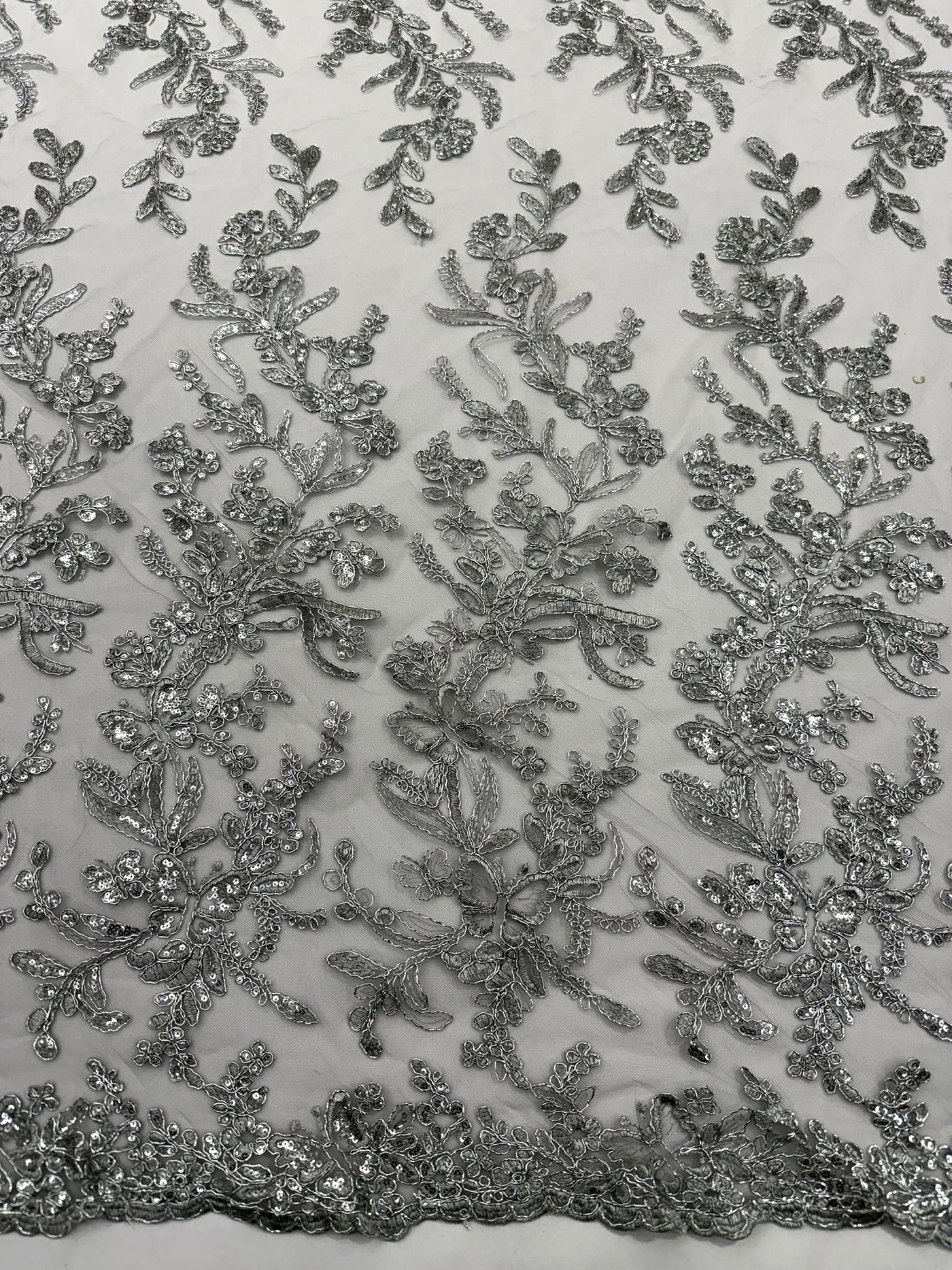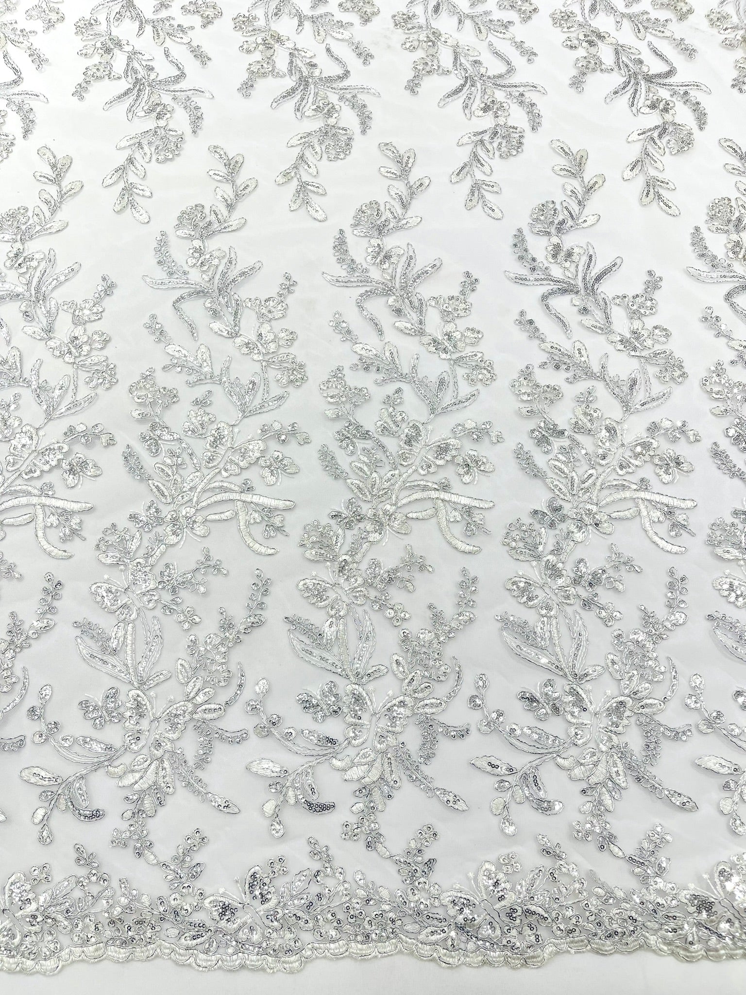This luxurious lace showcases beautifully embroidered butterfly metallic corded flowers, accented with sequins that catch the light beautifully, creating a captivating sparkle. The fabric features a double scalloped edge along the width, adding an extra layer of refinement to its exquisite design.