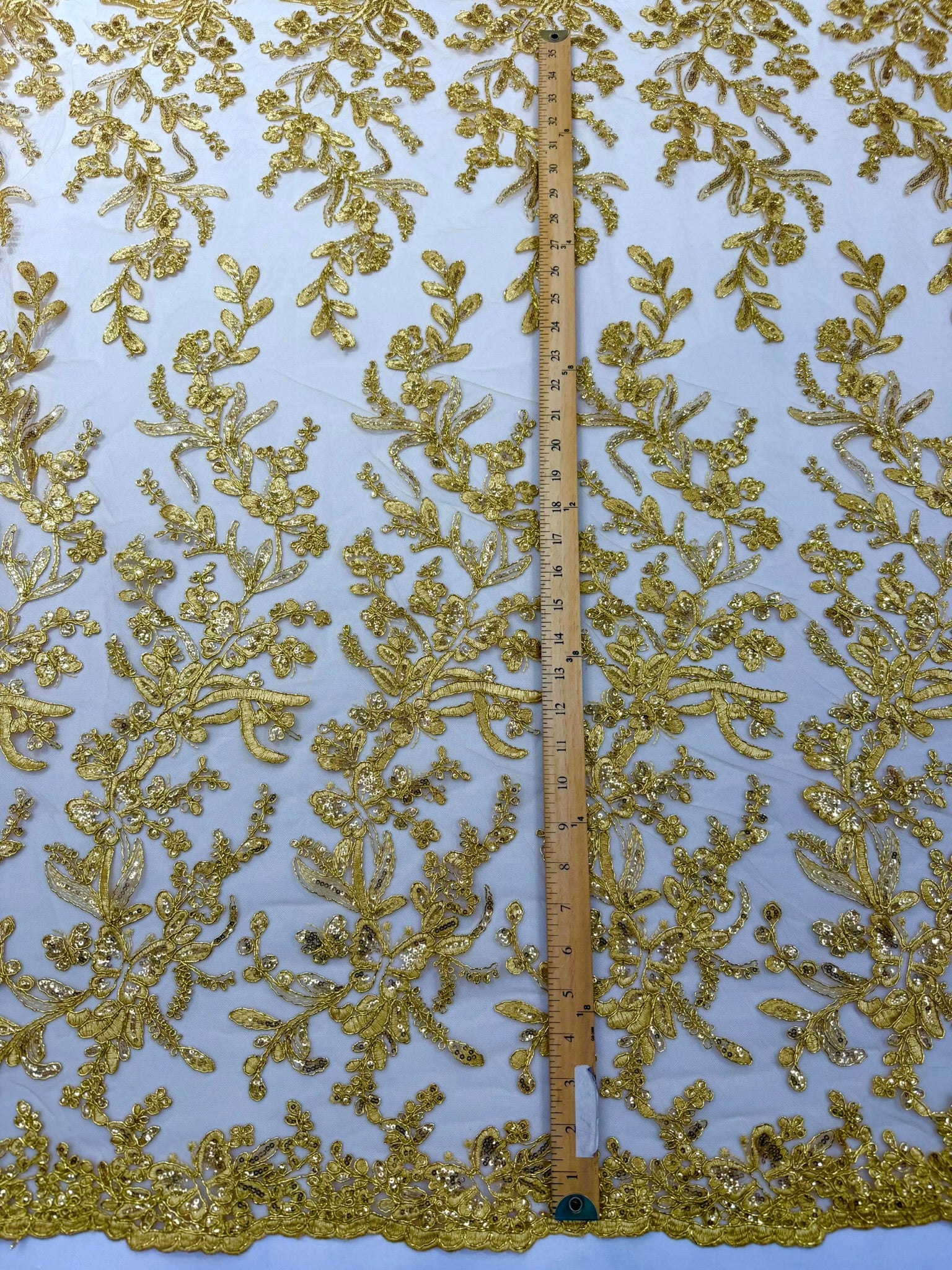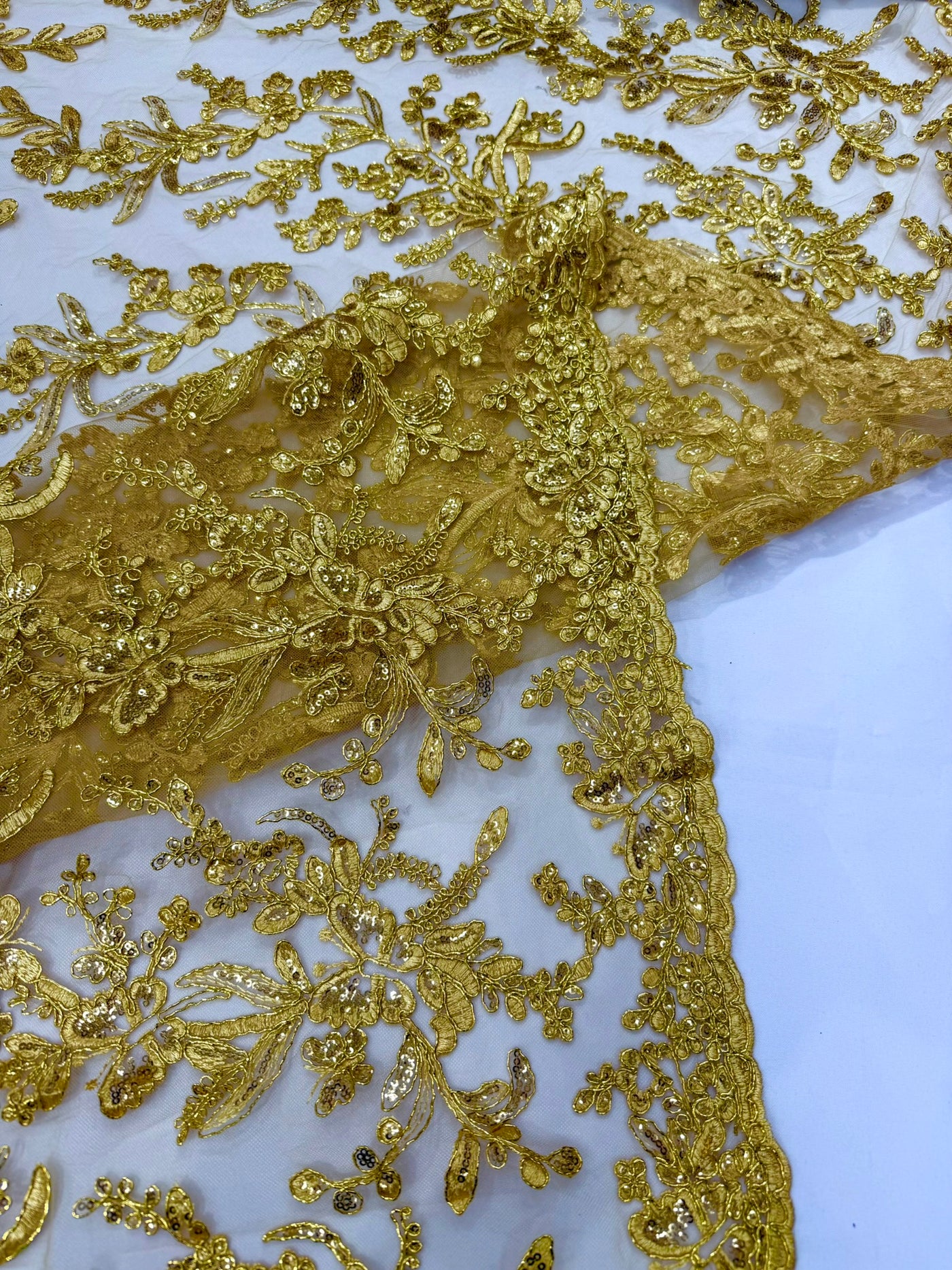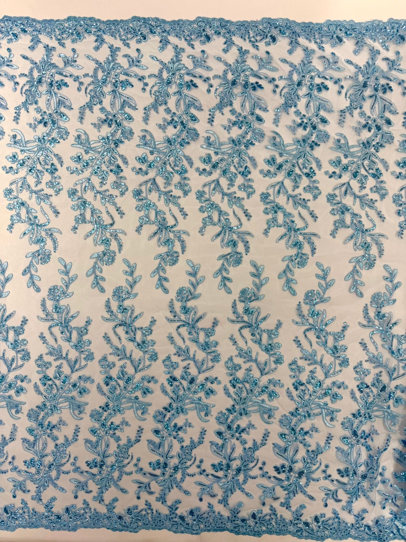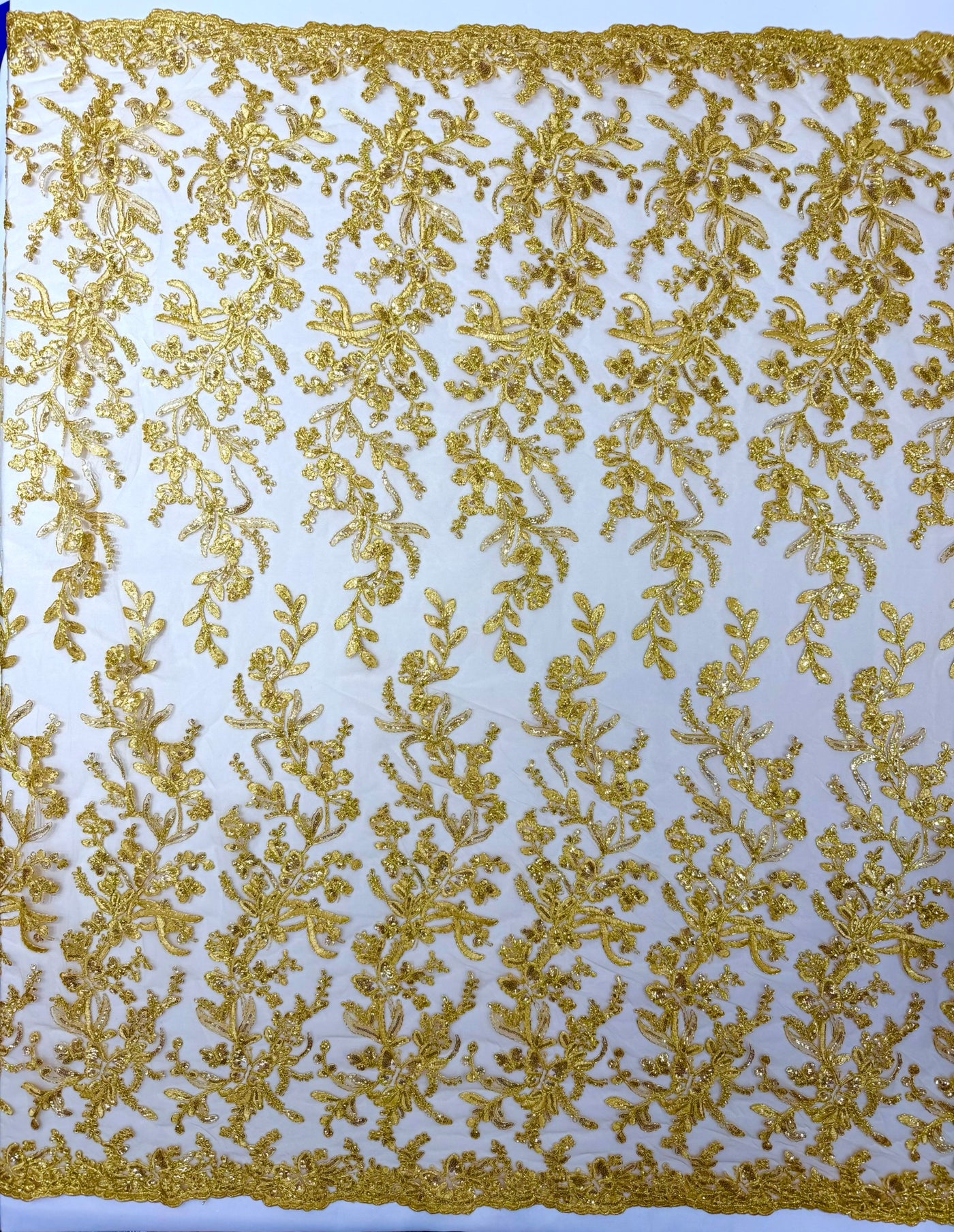 This luxurious lace showcases beautifully embroidered butterfly metallic corded flowers, accented with sequins that catch the light beautifully, creating a captivating sparkle. The fabric features a double scalloped edge along the width, adding an extra layer of refinement to its exquisite design.