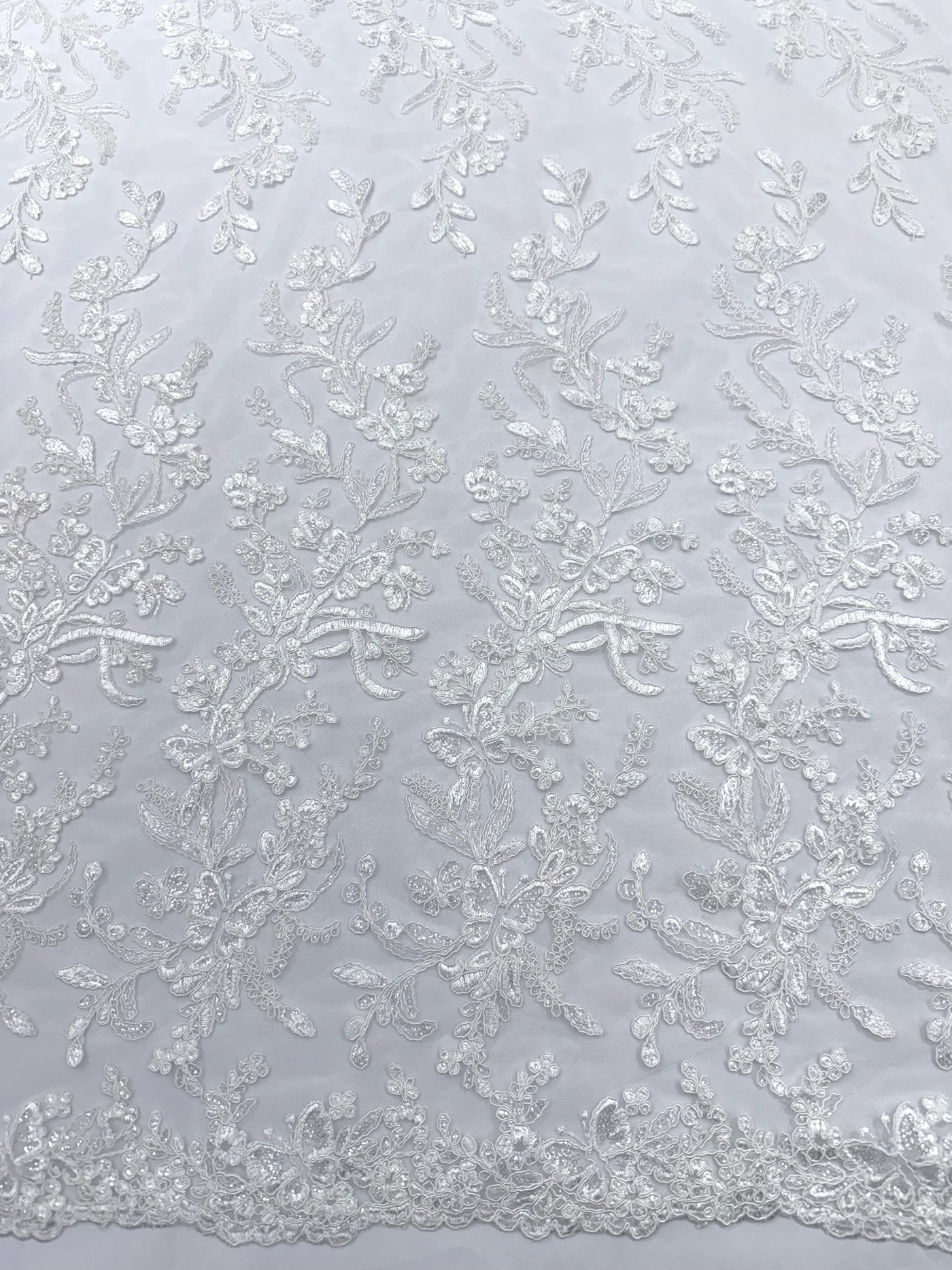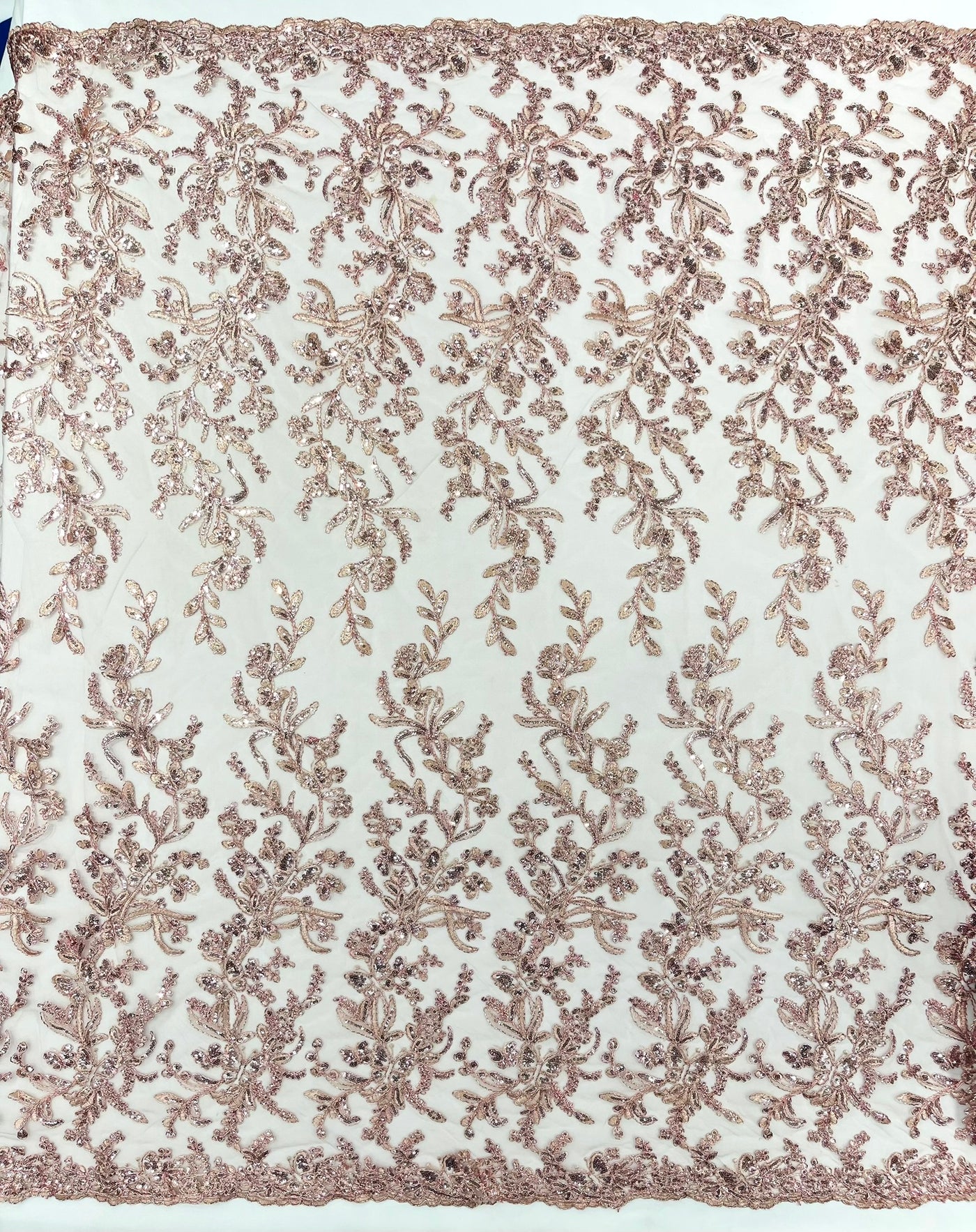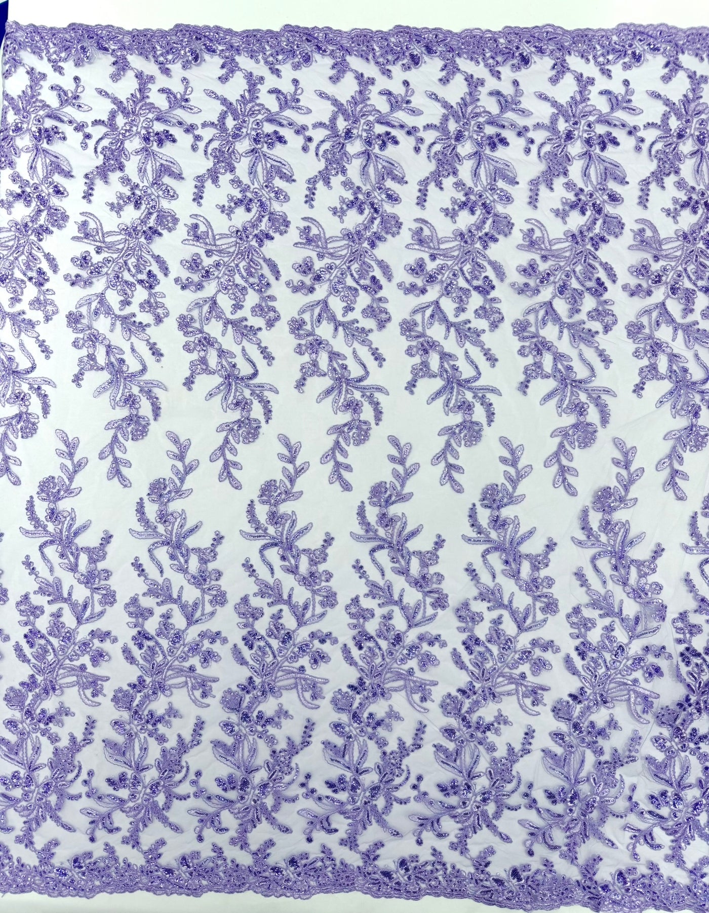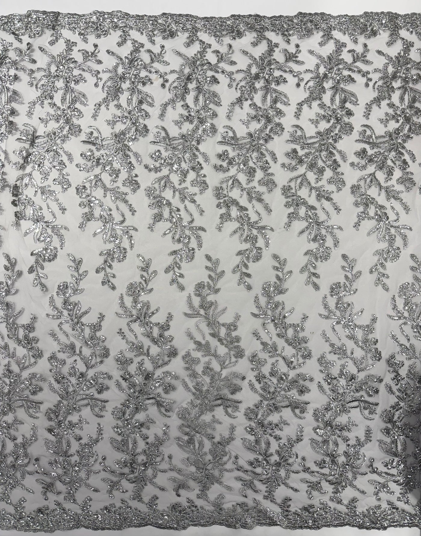 This luxurious lace showcases beautifully embroidered butterfly metallic corded flowers, accented with sequins that catch the light beautifully, creating a captivating sparkle. The fabric features a double scalloped edge along the width, adding an extra layer of refinement to its exquisite design.