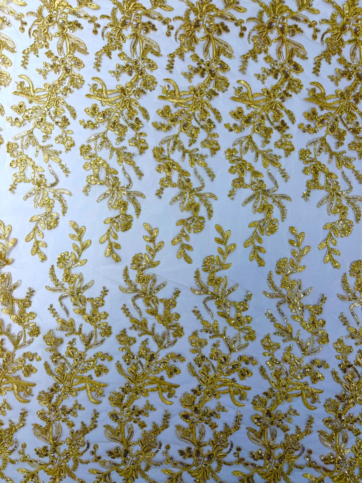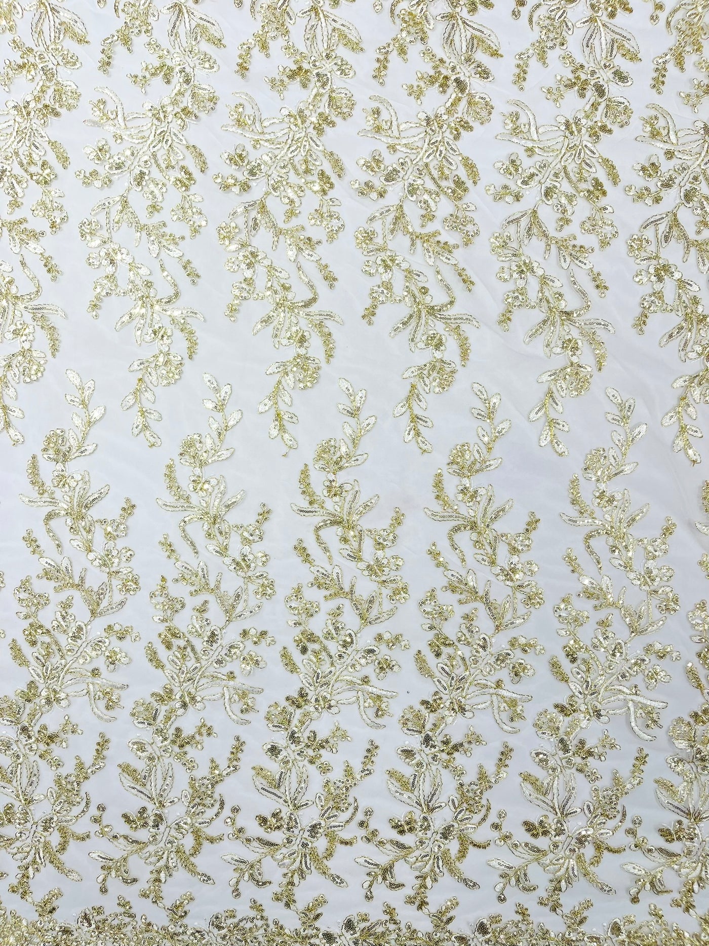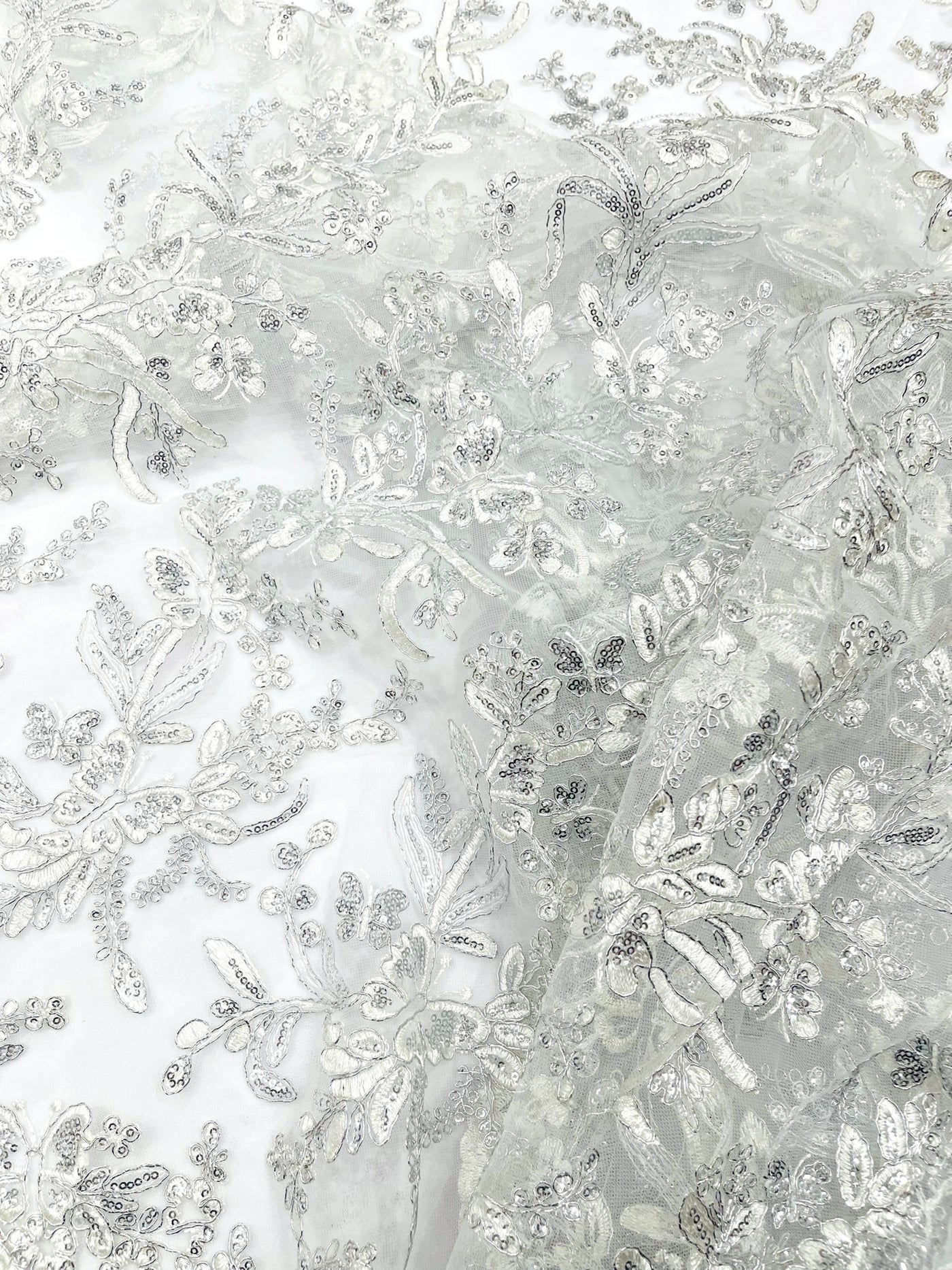 Elevate your creations with this stunning metallic corded lace featuring intricate butterfly embroidery and shimmering sequins on a delicate mesh fabric. Perfect for adding a touch of sophistication and elegance to any special occasion or project.